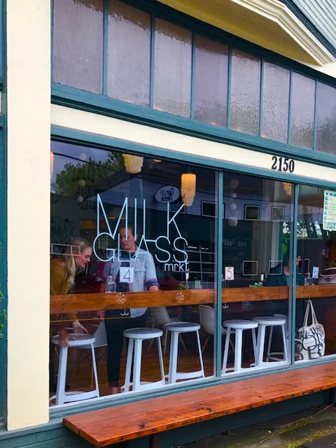 Back home here in Portland I had been hearing consistent praise for another cafe, Milk Glass Market. Located in the North Portland neighborhood, this farm to table gem is a micro-market, counter service cafe by day and table service restaurant Friday and Saturday nights. Past Sunday morning I arrived with family in tow, ten minutes prior to opening and just before a line began to form. The wait is justified. Each dish sampled was a well conceived composition of contrasting flavors and textures form the buttery sky high biscuits slathered with soft, tangy Spanish Miticrema sheep's milk cheese and a dollop of lightly spiced sweetly acidic ripe tomato marmalade, a veggie sando with  briny, crisp, pickled beets, carrots and roasted red peppers dressed with a rich and creamy cashew butter on light housemade focaccia , to a smoked trout plate with pickled beets, perfect soft hard boiled eggs and capers. Lastly was the warm goodness of a brown butter cake with silky creme fraiche and tart, sweet blueberry compote. Can't wait to return for a dinner!